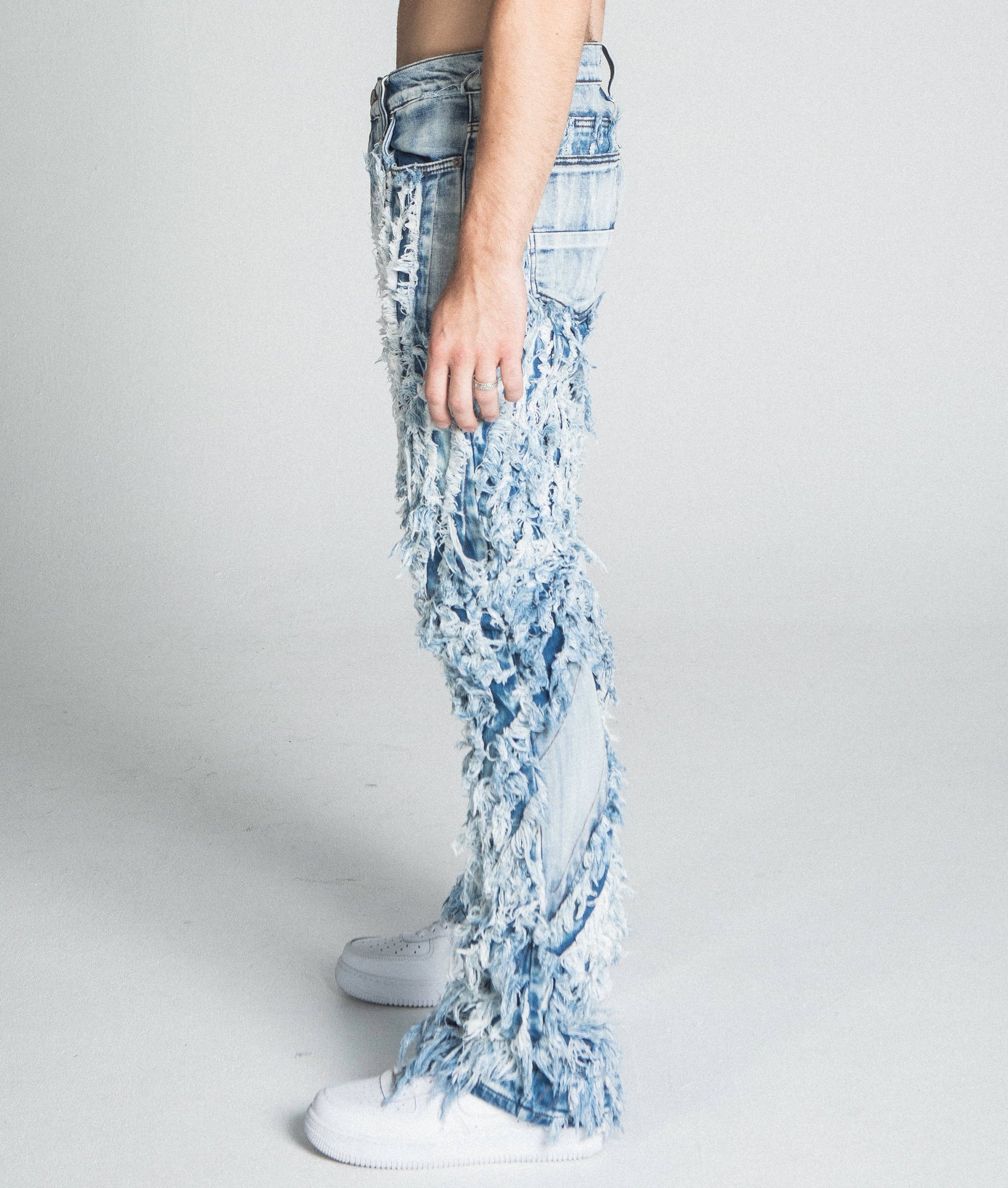 Traditional wash stacked leg jeans with extreme frayed design, belt loops, and a zipper fly and top button fastening. Made from cotton.
