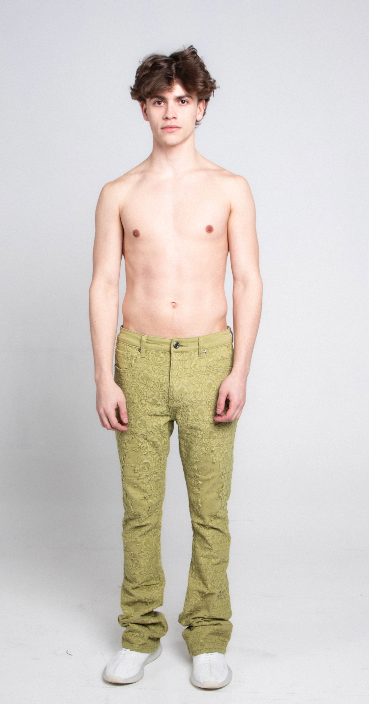 Lace stacked leg jeans with a five-pocket design, belt loops, and a zipper fly and top button fastening. Made from cotton.